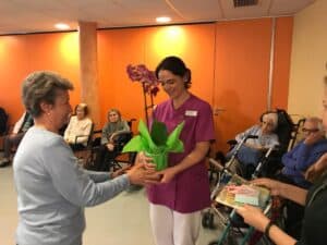 Por último, los mayores hicieron entrega de un regalo a Nuria Girbau, nuestra coordinadora de fisioterapia que, tras varios años en el Centro, nos deja para volver a su ciudad natal y empezar una nueva aventura profesional. Nuria ha sido una gran compañera, profesional y amiga y, tanto para los mayores como para los profesionales, la echaremos muchísimo de menos. Como despedida, Lucía Dutch escribió y leyó una poesía para Nuria con la que fue imposible no emocionarse.